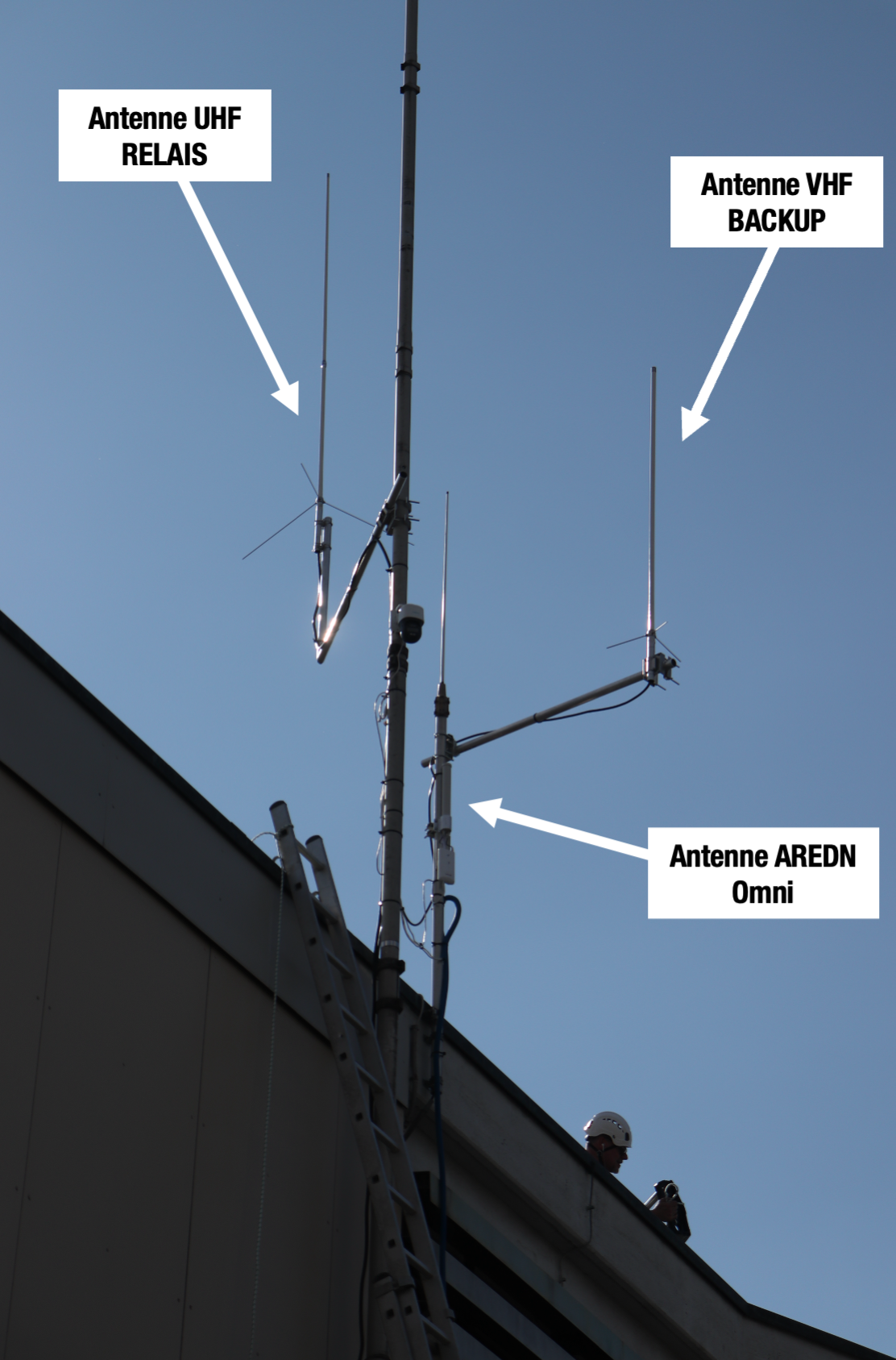 Chaque site est équipé d’une radio VHF/UHF permettant de communiquer via le relais de Fribourg, ainsi que de radios portatives pour les communications internes aux sites. Toutes les installations radio sont alimentées par des prises de courant secourues. Le site de Fribourg dispose également d’un poste VHF/UHF avec une antenne séparée, en redondance si le relais devait cesser de fonctionner.